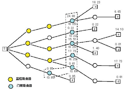 图2为图1中在S和R(3)之间引入了监视路由器后的方式。请注意,图中R(3)所属的三个路由器的门限值被取消,因为在这些路径上并没有任何攻击。