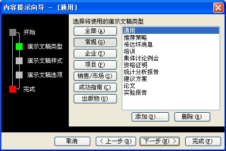 内容提示向导:可直接采用包含建议内容和版式设计的演示文稿,内容提示向导包括不同主题的文稿示例,例如论文、实验报告、培训、贺卡、项目总结等。用户可以根据自己的需要选择一种已婚丧嫁娶的模板,快速创建一份专业的淙文稿。