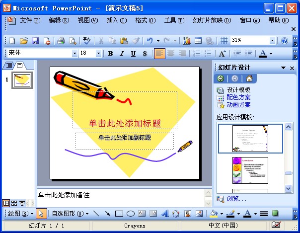 ② 在窗格中用鼠标单击要应用于演示文稿的模板,所选中的设计模板即可应用在当前的幻灯片中,如图所示。