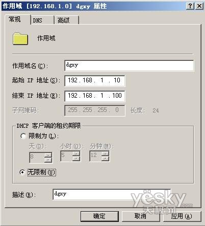 要想使用永久的IP地址,设置时,在DHCP对话框的作用域名称上单击右键,在弹出的右键菜单中选择“属性”命令,打开“属性”对话框,在“常规”项中将“租约期限”设置成“无限制”(图2),这样客户端电脑就可以获取永久IP地址了。