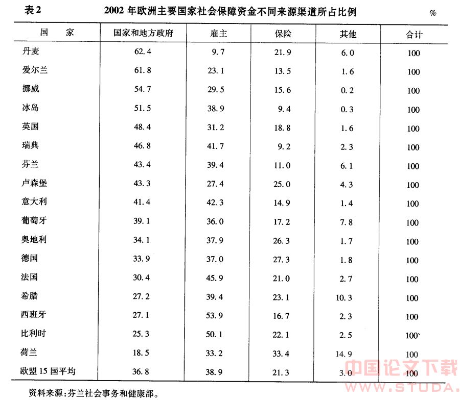 长期以来,北欧国家的社会保障所需资金筹措一直是采取多元渠道,即由政府、雇主、个人和保险市场共同负担。不同国家政府、雇主和被保险个人在社会保障财政来源中所占比例的不同,反映出他们在社会保障制度中所承担责任的差别。从表2中可以看出,北欧等国社会保障财政来源主要依靠中央和地方政府财政,这部分来源在社会保障资金中占40%以上,丹麦则超过60%。在瑞典和芬兰,雇主缴纳的社会保障费在社会保障资金来源中占第二位,而个人缴费和保险市场所承担的责任相对较少。这也是福利型社会保障制度的普遍特点,只不过北欧国家表现得更为明显。丹麦与瑞典、芬兰有所不同,保险所占比例相对较高,约为社会保障支出总额的20%,而雇主缴纳资金比重不到10%。