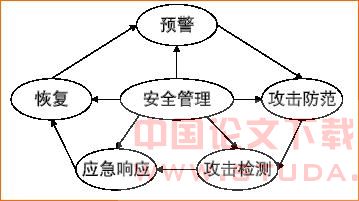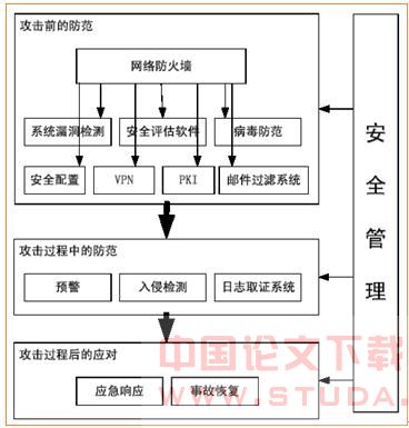 网络与信息安全防范体系流程主要由三大部分组成:攻击前的防范、攻击过程中的防范和攻击后的应对。安全管理贯穿全流程如图3所示。网络与信息安全防范体系模型流程不仅描述了安全防范的动态过程,也为本方案的实施提供了借鉴。