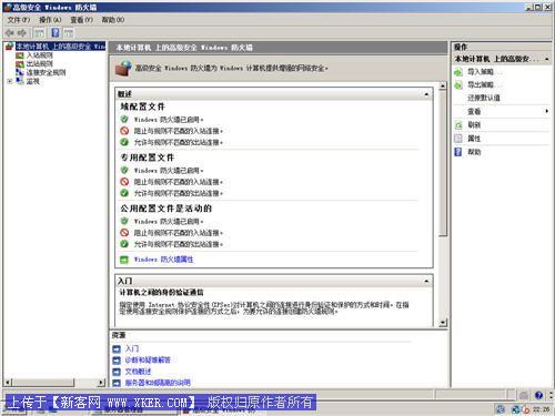 默认情况下,当你第一次进入Windows高级安全防火墙管理控制台的时候,你将看到Windows高级安全防火墙默认开启,并且阻挡不匹配入站规则的入站连接。此外,这个新的出站防火墙默认被关闭。