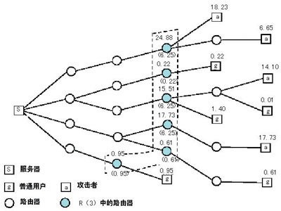 图2为图1中在S和R(3)之间引入了监视路由器后的方式。请注意,图中R(3)所属的三个路由器的门限值被取消,因为在这些路径上并没有任何攻击。