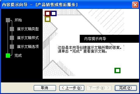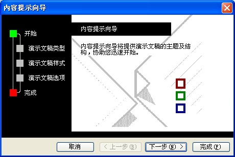内容提示向导:可直接采用包含建议内容和版式设计的演示文稿,内容提示向导包括不同主题的文稿示例,例如论文、实验报告、培训、贺卡、项目总结等。用户可以根据自己的需要选择一种已婚丧嫁娶的模板,快速创建一份专业的淙文稿。