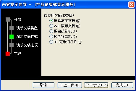 ④ 保持【屏幕演示文稿】为默认选项,单击【下一步】按钮,打开对话框。