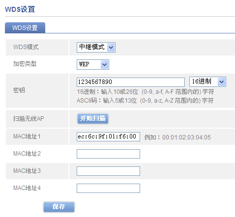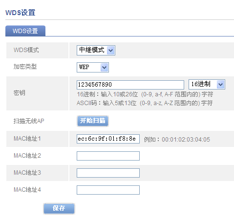 开启B路由器的WDS中继模式,加密方式选择一个,密钥填写正确,频道选择与A路由器相同频道,扫描,扫描AP,找到A路由器的SSID,连接,保存重启。