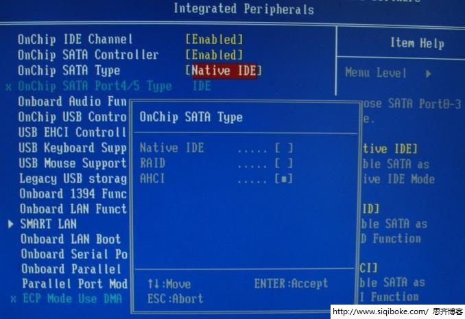 硬盘的AHCI模式的设置位置一般在Integrated Peripherals集成设备界面里,首先选择OnChip SATA Type,接着可以看到下面的三个选项,Native IDE/RAID/AHCI,如果需要关掉AHCI,则选择Native IDE即可,开启则选择AHCI。有些笔记本上可能只有AHCI和ATA还有DISABLE选项,可以选择ATA模式也可以。还有显示Compatible Mode兼容模式的,意思也是Native效果相同。