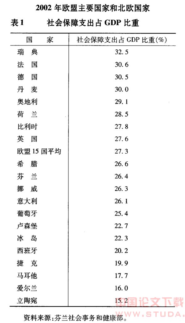 其实,根据芬兰社会保障和健康部提供的资料,不仅北欧国家,欧盟成员国中经济发展比较好的国家社会保障支出占GDP的比例都很高。2002年这一比例最高的是瑞典,约为32.5%,其次是法国(30.6%)、德国(30.5%)、丹麦(30%),芬兰为26.4%,而欧盟15国平均水平为 27.5%。相比之下,欧盟东扩后新加入的国家这一比例要低很多(见表1)。