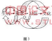 人的生活离不开社会,而生活的目的首先是为了生存。如马克思所说:“我们首先应当确定一切人类生存的第一个前提,也就是一切历史的第一个前提,这个前提是:人们为了能够创造历史,必须能够生活。”其次是为了更高层次的追求,包括物质方面追求和精神方面的追求。其实从更深层次来讲,社会生活的目的就是为了维护“社会”这个有机体的正常运转。因为生活的和谐是社会和谐的必要条件,高质量的社会生活能影响政治、经济改革的进程,并在思想领域里引起一系列的连锁反应,推动社会不断向前发展。所以,笔者所理解的“生活”是:人类为了维护“社会”这个有机体的正常运转,在与自然界和人类自身的互动实践过程中,不断调整和适应,从而创造出的种种方式。一定的生活方式会引起一定观念的变化,这种观念进而会形成习俗和文化;而观念改变又会影响生活方式的变化,同样也会引起习俗和文化的变化。其中的互动过程可用下图(图3)来说明。