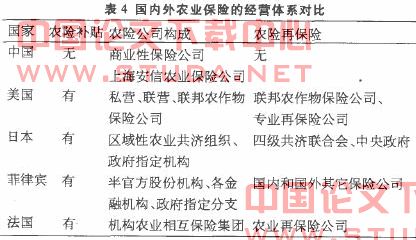 国外农业保险经营除了有政府的经济支持,还有完整的经营体系;而我国农业保险经营缺乏专业保险公司介入,资本结构单一,使得经营策略和具体业务受到局限。农业保险业务再保险更是一片空白,使保险公司的风险得不到有效分散和补偿。在这种不完整的经营体系下农业保险很难有发展的空间。