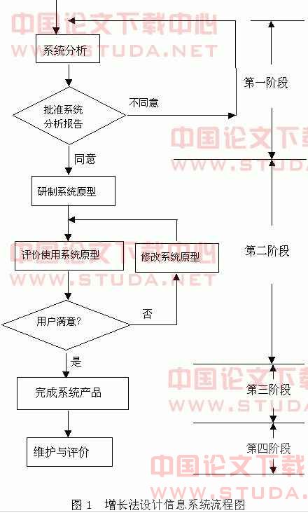 医院日常运作形式与特点决定了医院信息系统是企业信息系统中最复杂的一类信息系统,这是医院本身的目标、任务和性质所决定的。它不仅要同其他所有信息系统(IS)一样,追综与管理伴随人流、物流、财流所产生的信息,从而提高整个系统的运行效率,而且还必须支持以病人医疗信息记录为核心的整个医疗、教学和科研活动等信息管理。对于开发SY桯IS这样的大型复杂的管理信息系统,在系统设计思路上,我们采用成熟的增长法,它是生命周期法和原型法融为一体的先进实用的设计方法。用增长法设计信息系统可分为四个阶段:(如图1所示)